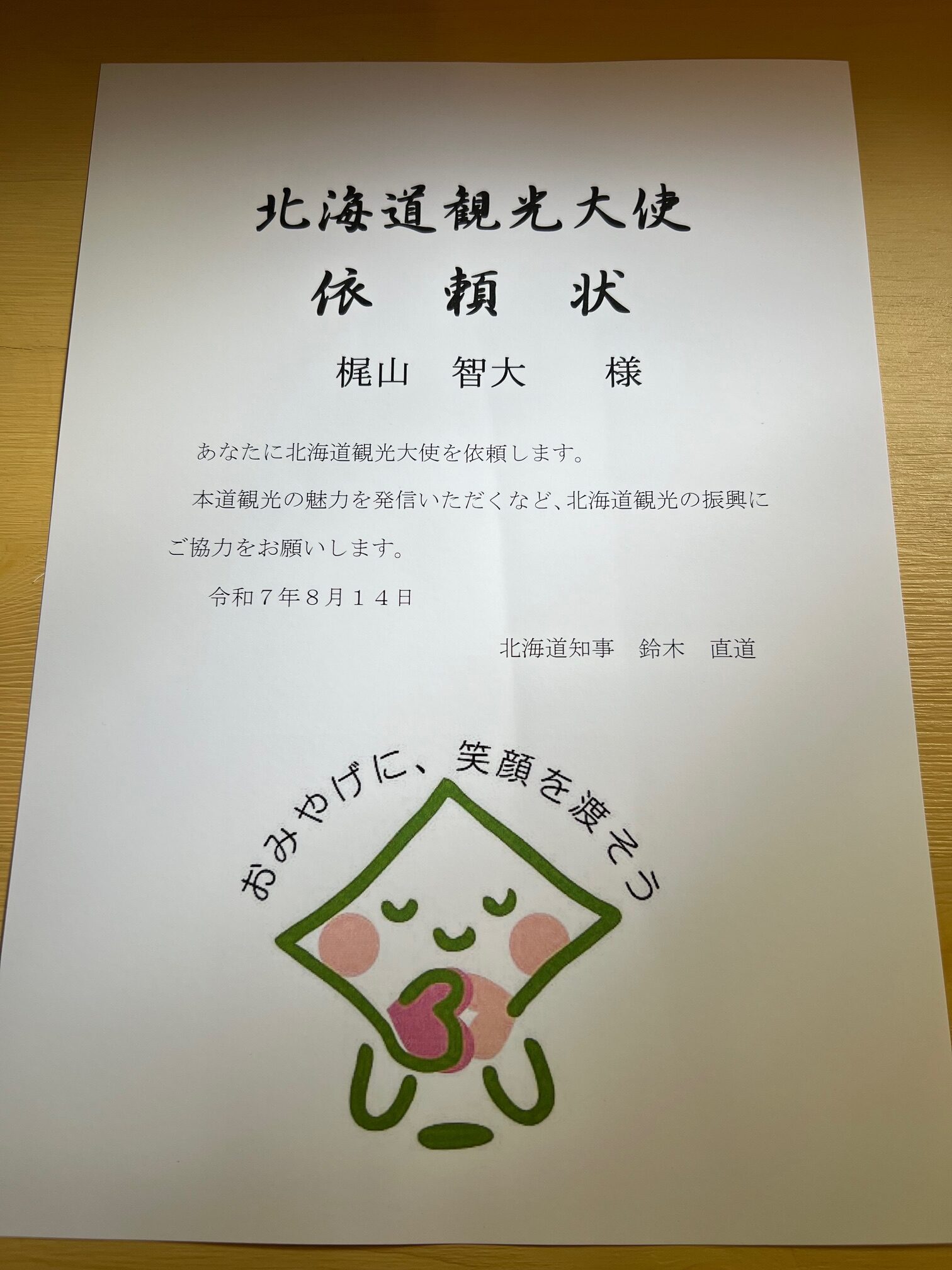 弊社代表取締役の梶山智大は、令和7年8月14日付で北海道観光大使に就任いたしました。