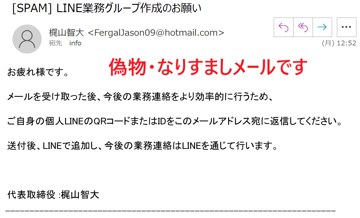 現在、弊社代表取締役・梶山智大の名前を不正に名乗り、LINEのQRコードやIDの送付を促す「なりすましメール」が送信されている事実を確認いたしました。